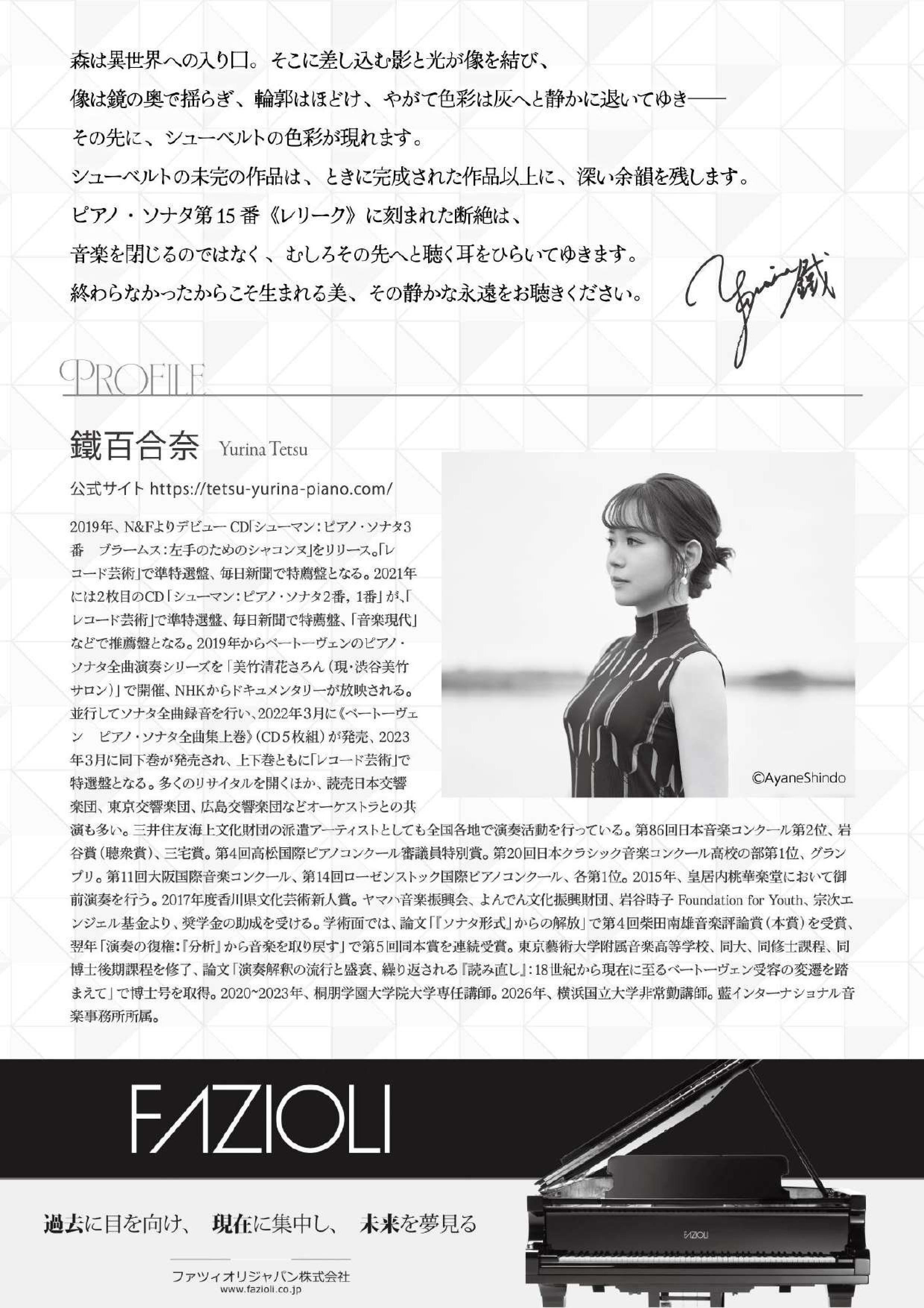鐵百合奈ピアノリサイタル「未完という永遠──シューベルト《レリーク》の彼方へ」