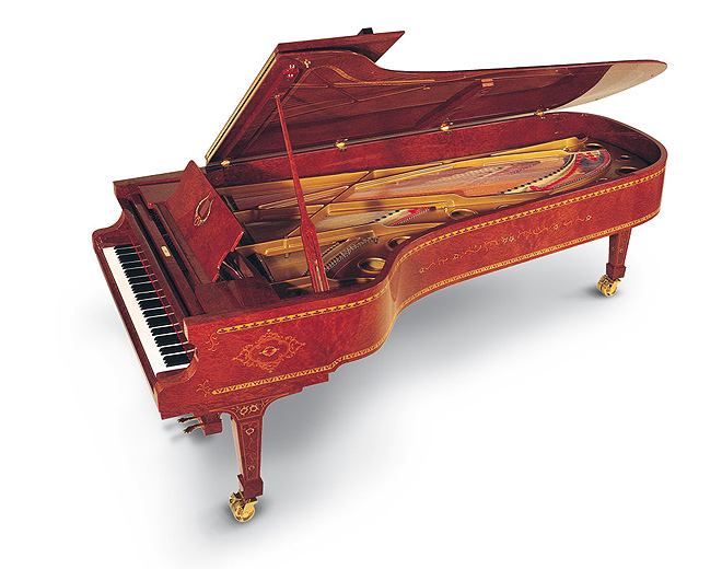 象嵌細工の芸術とも言うべき作品である。 貝殻による象嵌細工が花の模様やライアーという 古代ギリシャの竪琴を表現してゆく。 様々な色や種類の準宝石による 装飾が、 この貴重なセコイア・バールのF308の大きな特徴になっている。